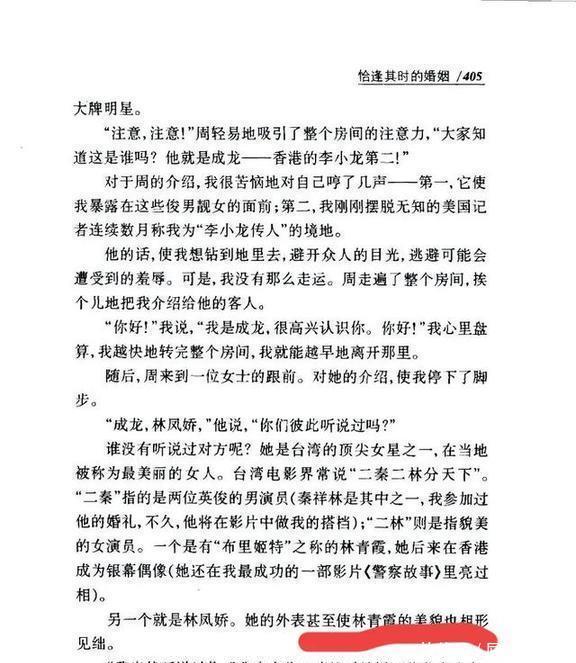 他跟米雪好过,送花送跑车的,挺浪漫。后来追邓丽君,说邓丽君特别优雅,气质高贵,跟她在一起自己都有点自卑。这么多段感情里,最后只有林凤娇坐稳了“龙大嫂”的位置。成龙在自传里提起老婆林凤娇,那夸人的话简直一套一套的,一点不藏着掖着。