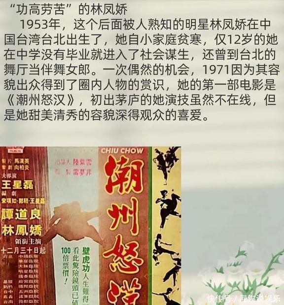 才12岁,她就不得不辍学出去打工,挣点小钱补贴家用。刚出来那阵子,为了活下去,还当过伴舞女郎。19岁那年,因为长得漂亮被人看中,演了人生第一部电影《潮州怒汉》。