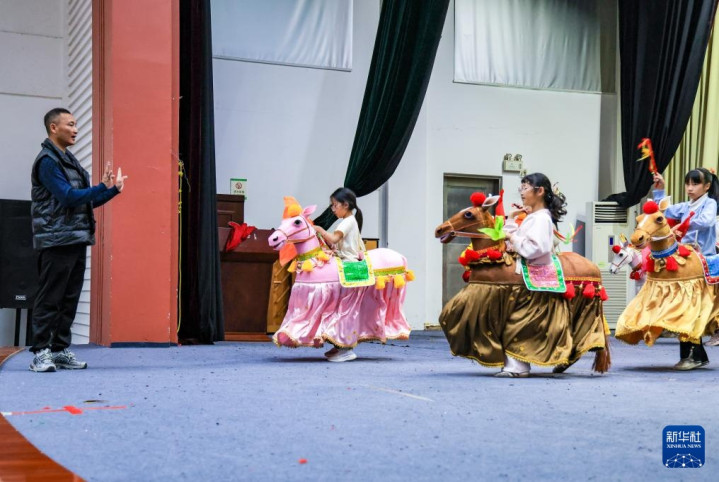 2月4日,在广东省潮州市饶平县青少年宫,饶平布马舞市级代表性传承人刘树钊指导少儿布马舞队队员排练。新华社记者毛思倩摄